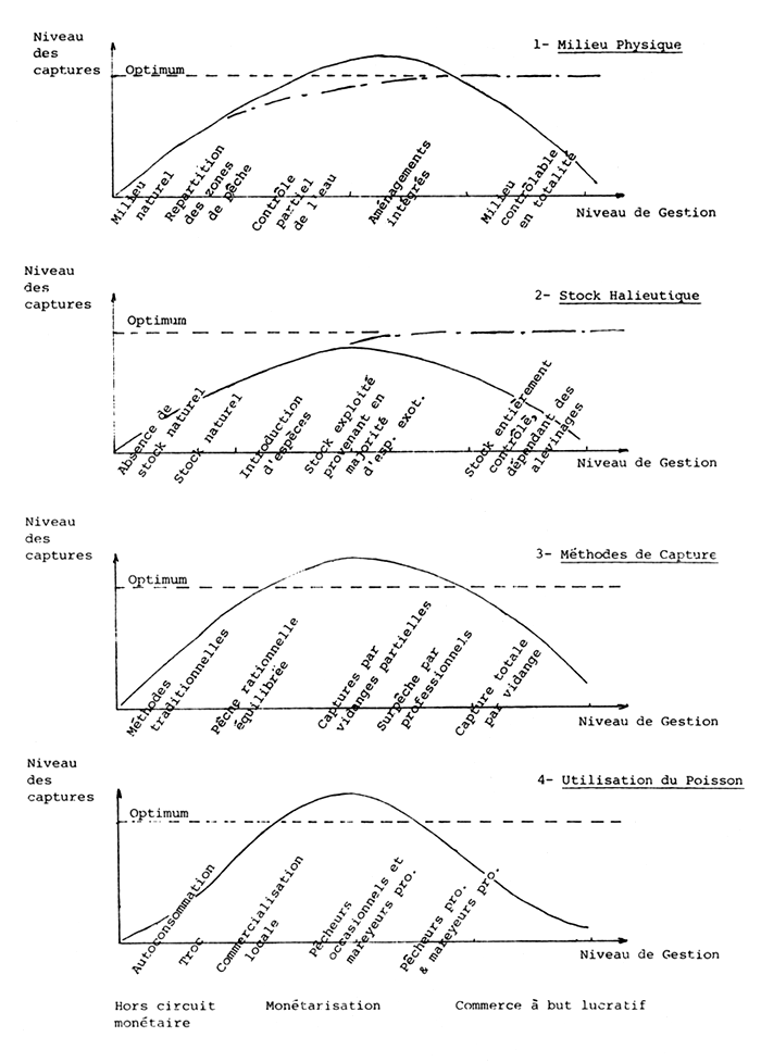Pour chacun des éléments pris individuellement, l'augmentation du niveau de gestion conduit à une augmentation des captures, depuis un niveau très bas correspondant à une exploitation traditionnelle (sous-exploitation), en passant par un niveau optimal de captures (total des captures voisin de la productivité du stock halieutique), pour arriver à un épuisement du stock par suite de surexploitation. En effet, l'un des quatre éléments porté tout seul à un niveau élevé de gestion va produire un déséquilibre dans l'exploitation du PPE et va conduire, soit à une dégradation du milieu, soit à une surexploitation du stock, soit encore à une faillite du système d'utilisation du poisson. Quoiqu'il en soit, la productivité du PPE va être réduite au détriment des riverains.