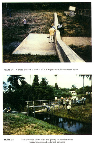 On streams or rivers with gentle gradients it may be difficult to install sharp-crested weirs which require a free overfall on the downstream side. The alternative is weirs which can operate in the partly submerged condition. An example is the USDA-ARS triangular weir shown in Plates 24 and 25. This is nearly a standard weir in the sense that rating tables are available (USDA 1979), but the rating is influenced by the velocity of approach and the calibration should be checked by current meter measurements. Another example, which might be called either a flume or weir, is shown in Plate 26 and also requires rating by current meter.