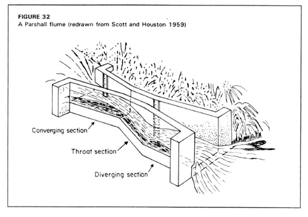 A wide variety of materials has been used for making Parshall flumes. They can be prefabricated from sheet metal or timber, or they can be constructed in the field from brick and plaster using a prefabricated metal skeleton to ensure that the exact measurements are achieved (Plate 29). If a number of flumes are required, they can be cast in concrete using reusable shuttering. Spot measurements of the depth of flow may be read from a gauge post set in the wall of the flume or, if continuous records are required, a float-operated recorder can be installed in a stilling well at the specified position.