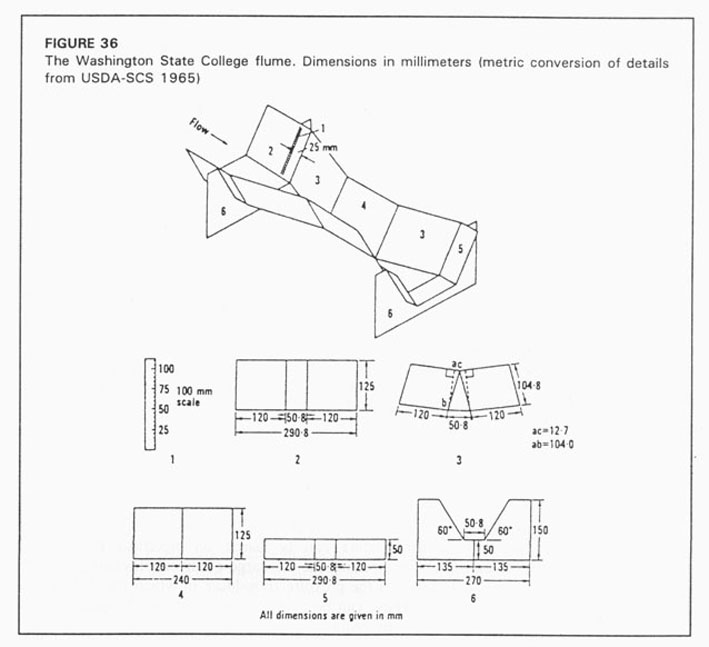 Several flumes have been developed in the USA for use in particular situations, and are widely used in spite of the awkwardness of the units of measurement. The design, construction and laboratory calibrations were all done in fps units, and until some laboratory undertakes the huge task of starting again in metric or SI units, the practical approach is to construct the flumes according to the original specifications in feet, and use the metric conversions of flow rates which have been computed by a consortium of hydraulic laboratories in The Netherlands (Bos 1976).