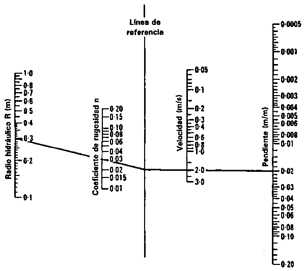 En sentido estricto, el gradiente de la superficie del agua debería utilizarse en la fórmula de Manning; es posible que no sea el mismo gradiente del lecho de la corriente cuando el agua está subiendo o bajando. Sin embargo, no es fácil medir el nivel de la superficie con precisión por lo que se suele calcular una media del gradiente del canal a partir de la diferencia de elevación entre varios conjuntos de puntos situados a 100 metros de distancia entre ellos. Se dispone de nomogramas para facilitar la solución de la fórmula de Manning, como indica el ejemplo de la Figura 25.