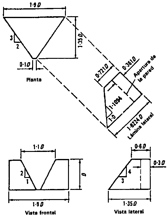 FIGURA 34 - Proporciones del aforador en H (de USDA-ARS 1979)