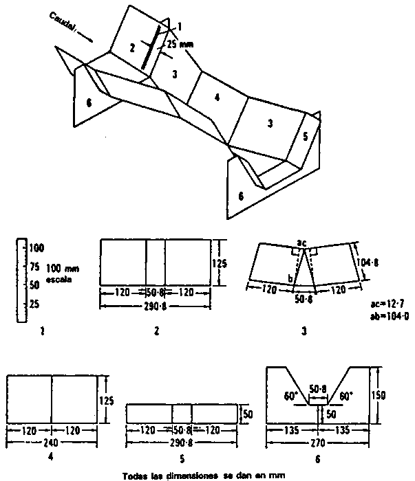 Este es otro aforador de profundidad crítica de un diseño similar al Parshall, que resulta particularmente útil como aforador portátil para mediciones eventuales de pequeños caudales en corrientes o canales sin revestir (Chamberlain 1952). Se puede prefabricar en fibra de vidrio (Fotografía 31) o en láminas finas de metal e instalarse en unos pocos minutos. Las dimensiones se dan en la Figura 36 y el calibrado en el Cuadro 9.