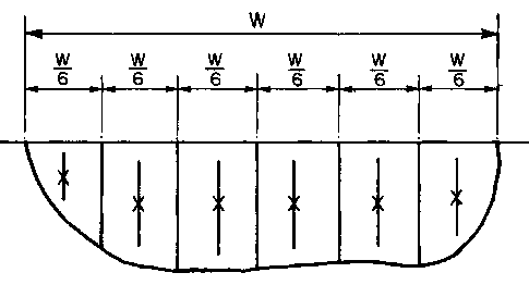 Un estudio de diversas técnicas de muestreo en Sudáfrica puso de manifiesto que las muestras obtenidas con botellas sumergidas suelen dar concentraciones aproximadamente del 25% inferiores a las que se obtienen con técnicas más perfeccionadas (Rooseboom y Annandale 1981). Para muestras únicas tomadas excavando con palas o cucharas, se recomienda una profundidad de 300 mm por debajo de la superficie como una fórmula mejor que la de obtener muestras en la superficie. Si la muestra se puede tomar a cualquier profundidad, se recomienda la mitad de la profundidad del caudal dado que es la que permite obtener los mejores cálculos de la concentración media de sedimentos. Cuando el programa de muestreo consiste en muestras obtenidas en secciones verticales en diversos puntos a través de la corriente, el esquema recomendado consiste en utilizar seis secciones situadas a igual distancia como se muestra en la Figura 38.