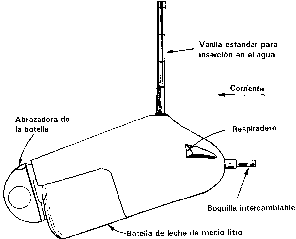 Para tener en cuenta las variaciones en la concentración de sedimentos en diferentes puntos de una corriente, se puede utilizar un muestreador-integrador, es decir, un muestreador que obtiene una muestra única agrupando pequeñas submuestras tomadas en diferentes puntos. En la Figura 39 se ilustra un muestrador típico, que está constituido por una botella de vidrio metida en una armadura con forma de pez que se monta sobre una varilla cuando se quiere medir la altura de corrientes pequeñas o se suspende a un cable para corrientes mayores. Para que la botella se llene fácil y regularmente cuando se encuentra por debajo de la superficie es necesario que disponga de una boca para la entrada del agua, y de un tubo para permitir la salida del aire. La boca se suele diseñar con una sección transversal ligeramente ampliada detrás del punto de entrada para reducir el peligro de una presión contraria que podría obstaculizar la entrada de la corriente en la botella. Cuando se está utilizando, el muestreador se desplaza desde la superficie hasta el fondo y vuelve a la superficie recogiendo la muestra en forma continua. Unos pocos ensayos determinarán cuánto tiempo hace falta para que la botella se llene durante este doble viaje. Ningún tipo de muestreador de botella debe seguir recibiendo más líquido una vez que la botella está llena porque eso provoca una acumulación de sedimento en la botella. En algunos muestreadores-integradores en profundidad la botella se saca del curso de agua cuando se ha llenado o poco antes de que se llene; otros tipos de muestreadoras pueden tener algún dispositivo para detener la entrada de agua una vez que la botella está llena.