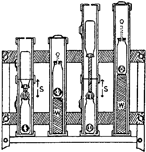 "Se toman también muestras debajo de la superficie en un recipiente que inicialmente está cerrado por una esfera de caucho atada a una varilla que sobresale de otro recipiente invertido como se indica en el diagrama. La longitud de la varilla es tal que la botella superior empieza a flotar, abriendo de ese modo el recipiente muestreador, cuando el nivel del agua ha alcanzado el orificio del tubo en la otra tubería. Por consiguiente, las muestras se toman más o menos al mismo tiempo en la corriente en y debajo de la superficie. El recipiente que saca muestras de debajo de la superficie se cierra por dentro cuando está llena con una esfera flotante, como en el caso precedente. Se prepara otro conjunto de tuberías para tomar muestras de la corriente a un nivel superior, como se indica en el diagrama." (Pereira y Hosegood 1962).