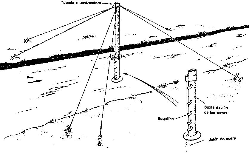"Se recogen muestras de superficie a través de un tubo metálico con pequeños agujeros que sobresale aguas arriba para evitar la turbulencia. El tubo lleva el agua hacia un recipiente de medio litro dentro del cual hay una esfera de caucho flexible que flota y cierra herméticamente la botella por dentro cuando está llena."