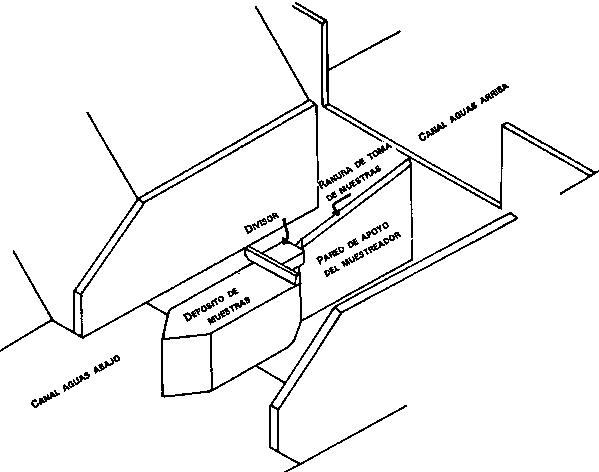 En las corrientes mayores las muestras se pueden tomar en un canal de aforo de turbulencia utilizando un muestreador de ranura como se muestra en la Figura 48 (Barnes y Johnson 1956). Brown, Hansen y Champagne (1970) describen una aplicación de este método. La ranura de toma de muestras es estrecha y tiene los bordes afilados; el agua y el sedimento caen en el muestreador a través de una tubería o canal que conduce a un recipiente. La ranura no debe ser demasiado pequeña para que no quede bloqueada por basura y para que pueda captar partículas más grandes; por ejemplo, una ranura con un ancho de 5 mm en un vertedero de 5 m de ancho tomará una muestra de un milésimo de la corriente. Si a pesar de ello sigue siendo demasiado grande para ser manejada con facilidad, se podrán utilizar otras subdivisiones, sea un divisor de ranuras o una rueda muestreadora tal como se describe en el Capítulo 3. Entre las dificultades que plantea este método cabe mencionar las siguientes: