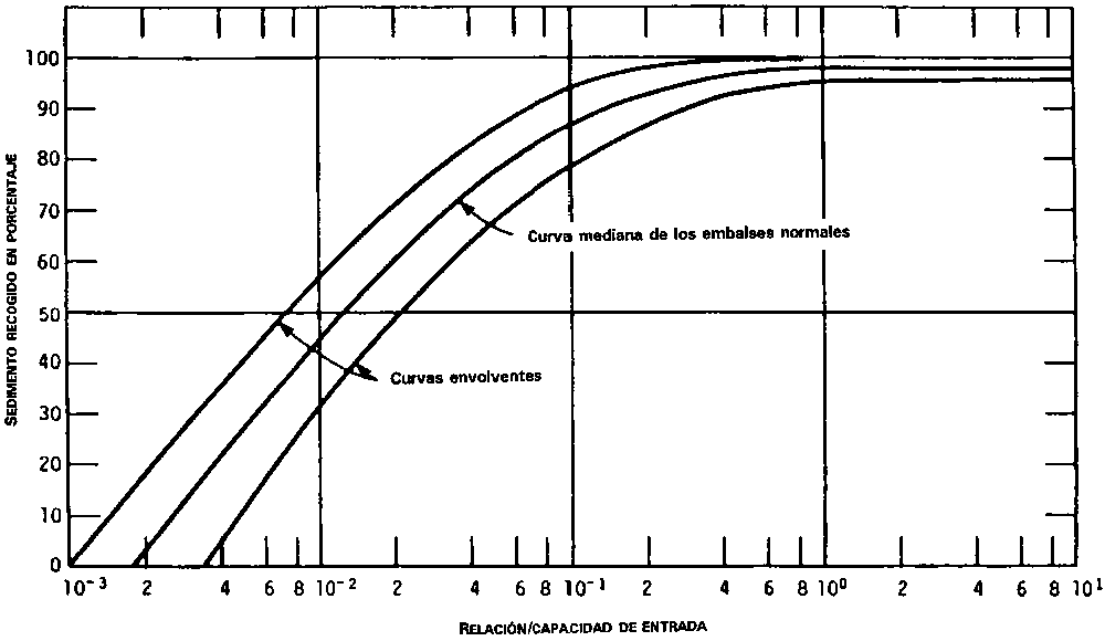 · la velocidad de la corriente a través del embalse que, combinada con la dimensión de las partículas del material en suspensión, determina el tiempo que falta para que el sedimento se asiente en el embalse. La eficiencia de captación puede calcularse a partir de la Figura 49 (Bruñe 1953).