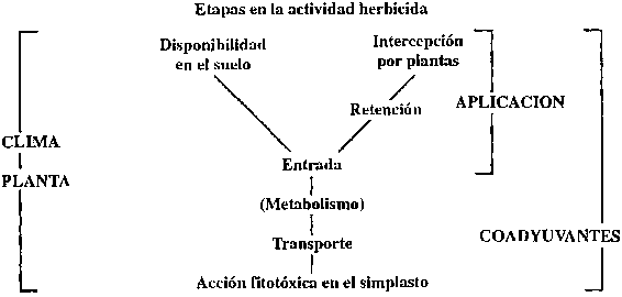 Problemas. Glifosato penetra el follaje con relativa lentitud y es vulnerable al lavado por lluvia. Normalmente se requiere un período de seis horas sin lluvia después de la aspersión para asegurar un efecto fítotóxico óptimo. Con dosis reducidas se requerirá un período más largo sin lluvia. Cuando las dosis son reducidas es importante agregar un agente tensoactivo apropiado. En los cultivos perennes se debe tener cuidado de evitar el contacto de la aspersión con los tejidos verdes de la planta, ya que aún a dosis muy bajas el desarrollo de los tallos y flores será afectado por vía sistémica. Bajo condiciones húmedas, las posturas para el trasplante y las plántulas de semillas son dañadas a veces por el contacto con el follaje de malezas tratadas con glifosato. Para información detallada sobre el modo de acción y uso de este importante herbicida vea a Grossbard y Atkinson (1985).