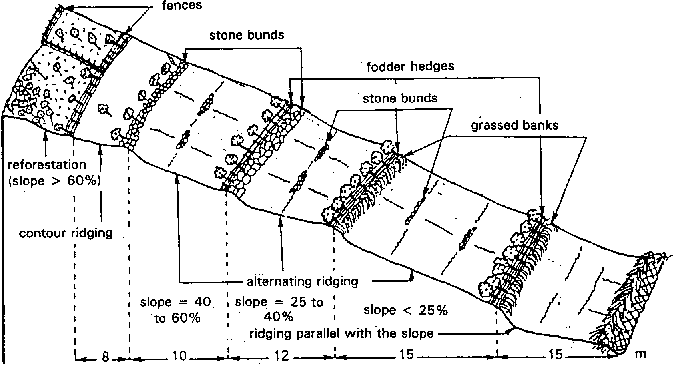 • small tied contour ridges from the summit down to the lower third of the slope; this accounts for the physical constraints of ridging and seems more effective than simple contour ridges in breaking the force of runoff and facilitating infiltration of rainwater;