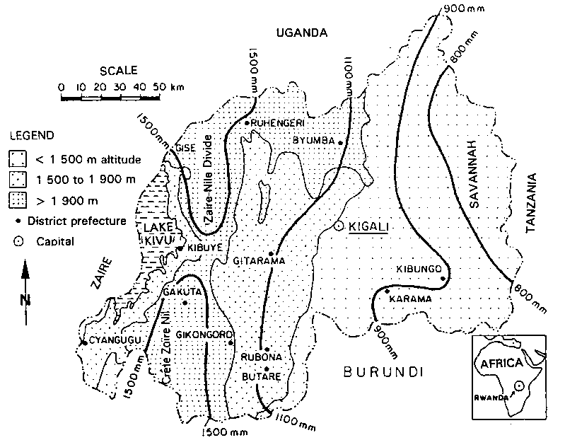A country with a thousand hills, Rwanda has a very wide variety of landscapes. There are six major bioclimatic zones, divided according to geological bedrock, landform, population density, crops, and especially rainfall, which increases with altitude (Delepierre 1982; Gasana 1990) (see Figure 70).