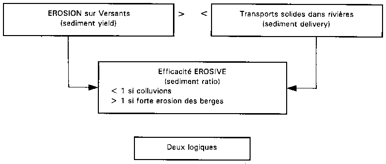 Sur les parcelles paysannes et sur les versants, les gestionnaires des terres, c'est-à-dire les paysans, les agronomes, les pédologues ou les géomorphologues, parlent d'érosion ou de pertes en terre (sediment yield). Dans la rivière, les hydrologues ou sédimentologues parlent de transport solide (sediment delivery), transport solide en suspension (argiles, limons et matières organiques, MES), et transport de fond (sables grossiers et galets en charriage). Entre l'érosion des versants et les transports solides dans la rivière, il peut y avoir de grandes différences provenant de ce que l'on appelle l'efficacité de l'érosion, "sediment ratio". En effet, au bas des pentes et dans la vallée, certains sédiments trop lourds se déposent, au moins temporairement: ils vont nourrir les sols colluviaux et alluviaux et n'atteindront la mer, ou un lac de barrage, que beaucoup plus tard. Le rapport d'efficacité de l'érosion est inférieur à 1. Les transports solides spécifiques (t/km2/an) diminuent à mesure que le bassin versant grandit. Par exemple, Bolline (1981) a observé sur les loess du Brabant belge un détachement de particules par la battance des gouttes de pluie de l'ordre de 130 t/ha/an sous une rotation de betterave et de blé. Les pertes en terre au bas de parcelles de 25 m de long n'atteignent que 30 t/ha/an et les transports solides dans la rivière voisine, à peine 0,13 t/ha/an. En France, Ouvry, Boiffin, Papy et Peyre (1990) ont montré que l'érosion sur les limons battants du Bassin parisien ne devient inquiétante que lorsque sont réunies les conditions favorables à la concentration du ruissellement: sol fermé par les croûtes de battance, faible couvert végétal, période humide prolongée, grandes parcelles où le remembrement a effacé les structures de gestion du ruissellement.