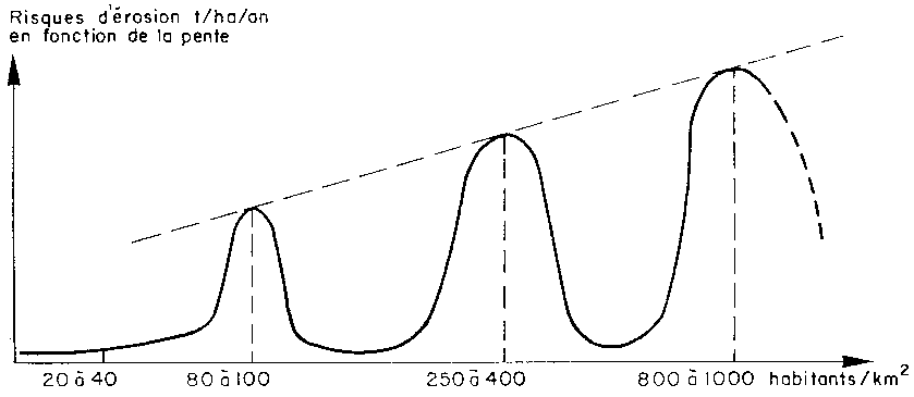 Certains auteurs prétendent que l'érosion augmente en fonction de la densité de la population (figure 4). Il est vrai que dans un système agraire donné, si la population dépasse certains seuils, les terres viennent à manquer et les mécanismes de restauration des sols se grippent (Pieri, 1989). Ainsi, en zone soudano-sahélienne, dès que la population dépasse 20 à 40 habitants/km2 , le temps de jachère diminue et devient inefficace: on parle d'une zone dense dégradée dès que la population atteint une centaine d'habitants par km2 . Les adultes sont alors obligés de migrer en saison sèche pour trouver un complément de ressources pour assurer la subsistance de leur famille (ex. Burkina Faso).