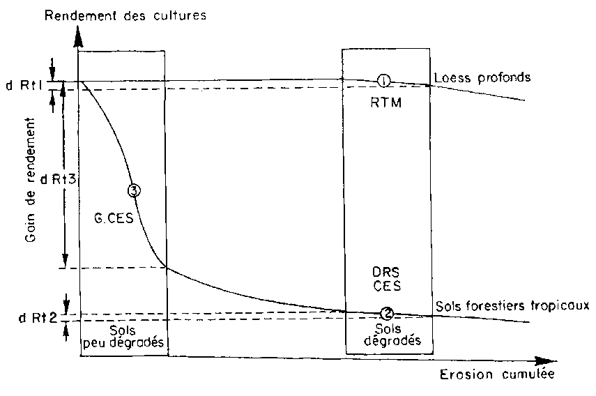 Pour obtenir une forte amélioration de la productivité des terres (dRT 3), ce n'est pas sur les terres épuisées, qu'il faut intervenir, ni sur les sols profonds (courbe 1), mais sur les sols à fertilité superficielle encore en bon état: la courbe 3 est beaucoup plus raide en cas de faible érosion que lorsque l'érosion est déjà forte et les sols trop dégradés. Cette approche est préconisée par la GCES, où l'amélioration modeste des systèmes de production permet un meilleur stockage des eaux pluviales, une plus forte production de biomasse, une meilleure couverture du sol et. Dar conséquent. beaucoup moins d'érosion.