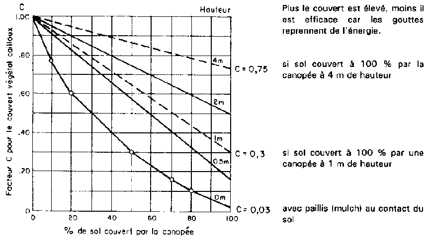 Du tableau 13, il ressort encore que l'érosion, et dans une moindre mesure le ruissellement, dépendent pour une large part de la proportion du sol non couvert par la végétation avant les grosses pluies. Il ne s'agit pas seulement de la matière verte produite sur un champ, mais de façon plus précise, de la projection verticale ou mieux, légèrement oblique du couvert sur le sol: lors des grosses averses, l'angle est généralement inférieur à 25° sauf lors de certaines tornades où il peut atteindre 45°. Il dépend aussi de l'architecture des plantes: hauteur du feuillage au-dessus du sol, disposition en gouttière comme un entonnoir concentrant les eaux (ex. ananas et maïs) ou au contraire en parapluie dispersant les gouttes (ex. manioc).