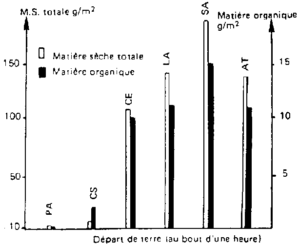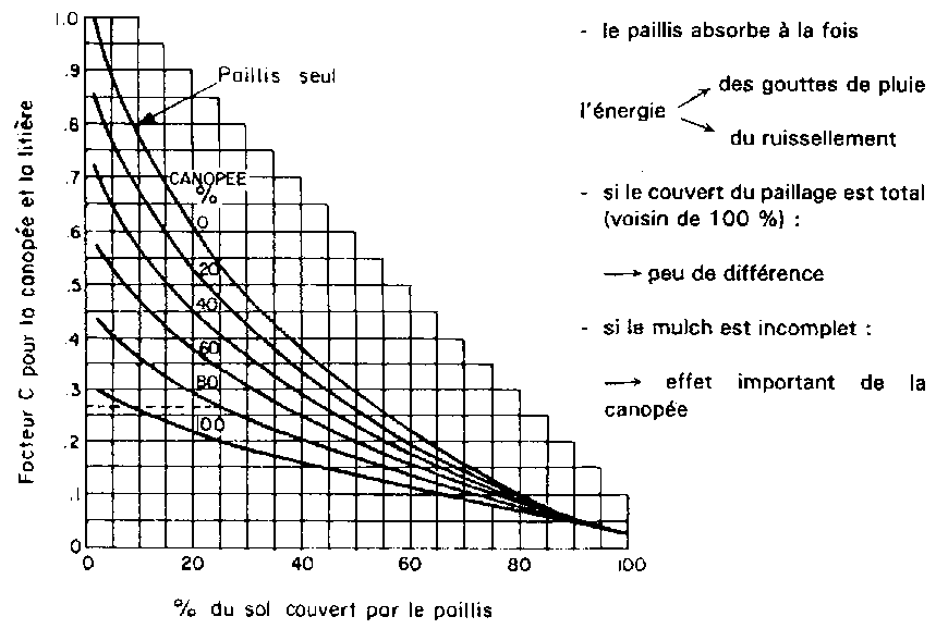 On constate donc que l'effet de la litière sur l'érosion est extrêmement rapide. Il n'est pas indispensable de couvrir tout le sol pour que le paillage soit intéressant pour lutter contre l'érosion. Si déjà, on couvre 20 %, on réduit l'érosion de 40 %. Si le paillage couvre de l'ordre de 40 %, on réduit l'érosion de 60 % et si l'on a couvert le sol à 80 %, on réduit l'érosion au 1/10ème de celle que l'on peut trouver sur sol nu.