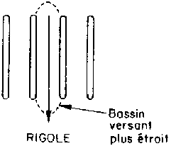 lors des pluies fortes, le ruissellement risque de déborder, de créer une brèche par où vont s'écouler toutes les eaux retenues derrière les billons, brèche qui va se transformer en ravine, plus difficile à effacer que les multiples petites rigoles qui drainent les billons orientés dans le sens de la pente (bassin drainant plus petit). | |||