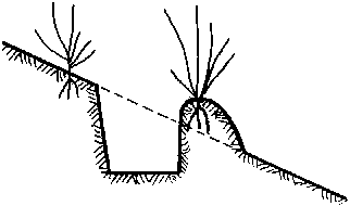 Le système probablement le plus connu d'impluvium permettant de récolter de l'eau sur des courtes pentes pour irriguer une culture d'arbres, est certainement les micro-bassins (figure 40). L'élément de base est une petite excavation formant un bassin d'infiltration et une bordure formée d'une diguette en terre de 20 cm de haut tandis que le bassin aurait 40 cm de profondeur. Les diguettes peuvent avoir une forme en V ou en demi-lune. En Israël, dans un nouveau verger, la zone d'infiltration serait de l'ordre de 4 x 4 m, tandis que l'impluvium aurait 3 à6 fois plus de surface.