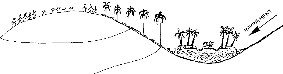 Dans les pages qui suivent, seront présentées schématiquement une dizaine de situations particulières auxquelles correspondent des aménagements différenciés en fonction du mode de gestion des terres, des situations écologiques générales (surtout le bilan hydrique par type de culture), et des conditions socio-économiques (surtout la pression démographique) [planche photographique 10].