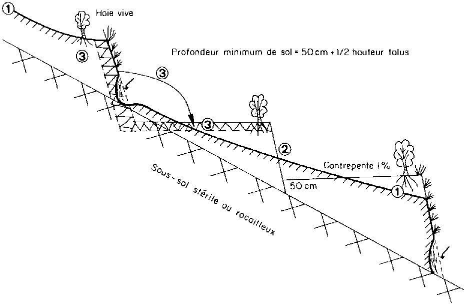 Les microbarrages perméables (cordons d'herbes, de pierres, haies vives, talus enherbés) n'arrêtent pas le ruissellement, mais ralentissent les eaux, dissipent leur énergie et les étalent en nappe en provoquant le dépôt des sédiments. Il se forme rapidement un talus (20 à 30 cm par an) et une terrasse progressive que l'on peut transformer en deux terrasses horizontales (gradin): l'une enrichie (réservée à la culture intensive), et l'autre appauvrie (cultures frugales comme le manioc et les patates douces) dont il faut restaurer la fertilité progressivement (voir figure 72). Le travail est plus progressif (50 jours à l'installation, plus 10 jours/an d'entretien) ainsi que le besoin en fertilisants.