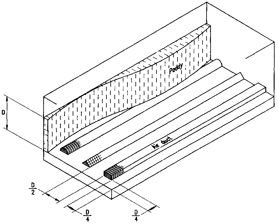 Large batch-in-bin dryers are usually round or rectangular and range in capacity from ten to several hundred tonnes. With large bins, air distribution ducts at the base of the bin are used rather than a plenum chamber. The ducts can be semi-circular, rectangular or triangular as shown in Figure 5.12 (see Figure 5.12. Air ducts for large Batch-in-Bin Dryer.). To ensure good air distribution through the bed, ducts should be spaced from each other at a distance of half the depth of grain and one quarter the depth from the end and side walls. Air velocity through the ducts should not exceed 5 m/s because of pressure drop factors. More than one fan can be used to provide the airflow required. Detailed information on duct design and airflow distribution is presented by Brooker et al. (1974).