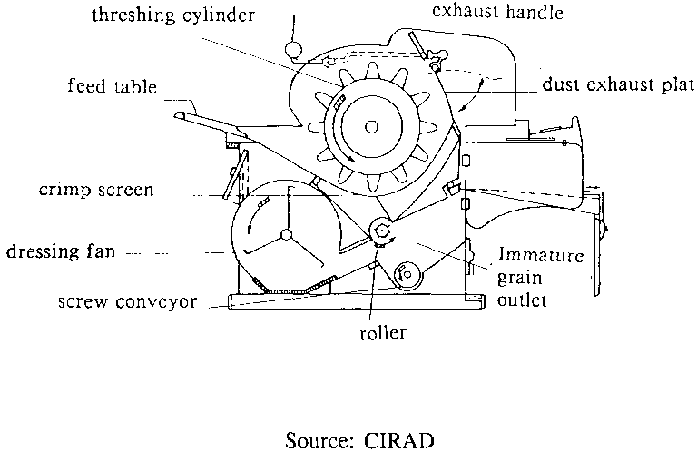 In France, CIRAD-SAR has designed and developed a machine which strips panicles from the plants and threshes them in only one pass (Figure 4.5). The stripper has been specially designed for harvesting paddy rice on small plots. The essential component is a wire looped in line with the direction of movement of the machine, which is mounted on a three-wheeled carriage and powered by a 9hp engine. With a 30 cm working width the stripper capacity is about 1 ha per day.