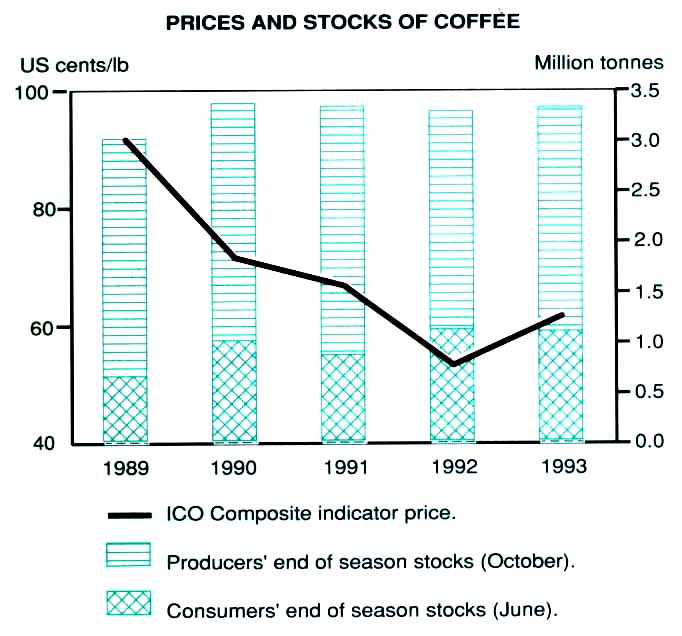 Production in 1992/93 was 5.51 million tonnes, the lowest since 1988/89. A sharp reduction in the Brazilian crop, to 1.44 million tonnes, was the principal reason for the drop. The crop suffered from the eradication of 800 million trees, some 23 percent of the previous total, and from unfavourable weather. Production also fell in the remainder of Latin America, especially in Colombia following the record crop of the previous year, and in Africa. Though cyclic and weather phenomena played their part, the major reason for the decline was that prices remained insufficient to cover the full cost of production thus reducing the scope for tree replacement and renovation. Of late, prices were also below the variable cost of production and undermined the level of husbandry. Only for the low cost producers of Asia did prices remain sufficient to support adequate husbandry. There, robusta production approached the feasible maximum reflecting the lower costs and young trees in these countries.