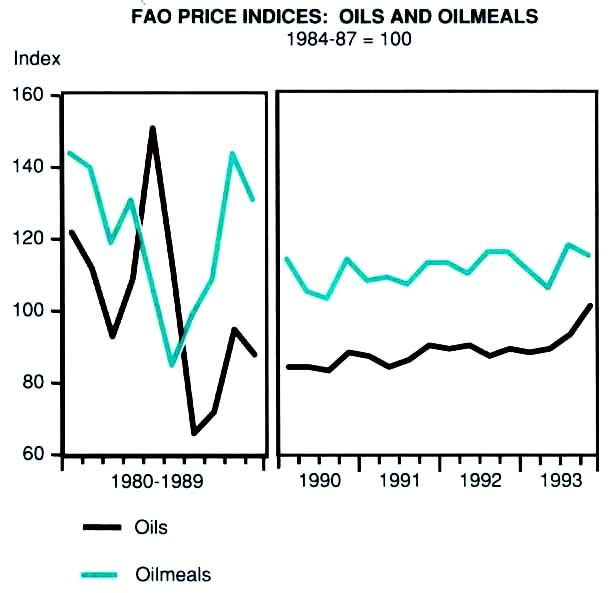 From the third quarter of 1993, the international market was heavily influenced by the prospective reduction in the forthcoming soybean crop in the United States and the consequent scarcity of oils and oilmeals during 1994. Prices of soybean oil in the fourth quarter rose to average 25 percent above those 12 months earlier, although the uplift for soybean meal was only 2 percent due to reduced demand from importing countries. The price of palm oil was an exception to the general lift in prices as this oil was expected to remain in ample supply throughout 1994. The overall FAO price index for oils was up 14 percent, in contrast there was a slight decline for oilmeals relative to the fourth quarter of the previous year.