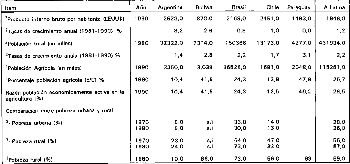 En el cuadro 5 se resume las condiciones socioeconómicas para los cinco paises participantes del Proyecto. El producto interno broto por habitante de Argentina, Brasil y Chile superó los EE.UU.$ 2 000 en 1990, lo que sobrepasó al promedio de América Latina, que fue de EE.UU.$ 1 946. Bolivia y Paraguay no alcanzaron el promedio de América Latina.