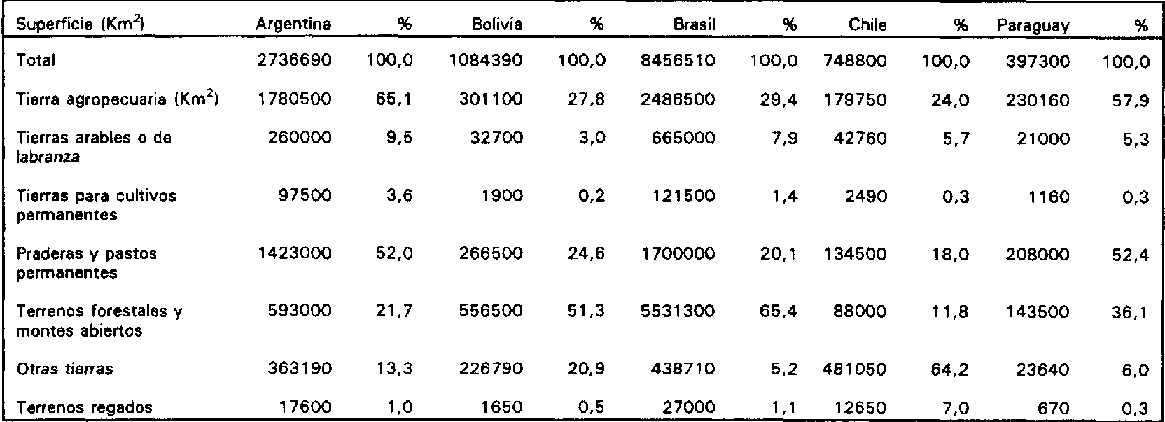 En el cuadro 6 se muestra el uso actual de la tierra para 1989. Argentina y Paraguay tienen una alta proporción de tierra apta para uso agropecuario (tierra de labranza, tierra para cultivos permanentes y pastos permanentes), que corresponden al 65,1 % y 57,9% respectivamente. Los tres paises restantes registraron entre 24 y 29% de tierras aptas para uso agropecuario.