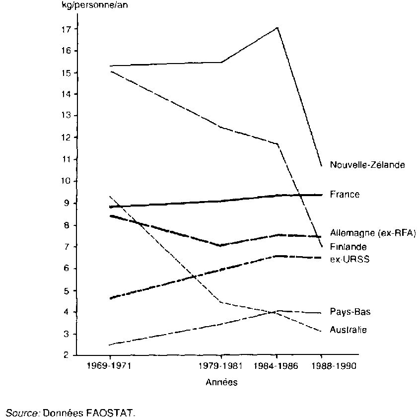 Enfin, dans d'autres pays (Bulgarie, ex-URSS, Koweit, Pays-Bas, Pologne et Tchécoslovaquie), elle a augmenté au cours de la période considérée, mais tend à se maintenir en plateau. La figure 8 visualise ces différents types d'évolution. En 1991 et 1992, la consommation de beurre dans l'ex-URSS a baissé en raison d'une réduction des importations qu'imposent le manque de devises et la rupture des courants commerciaux à l'intérieur de l'ex-COMECON.