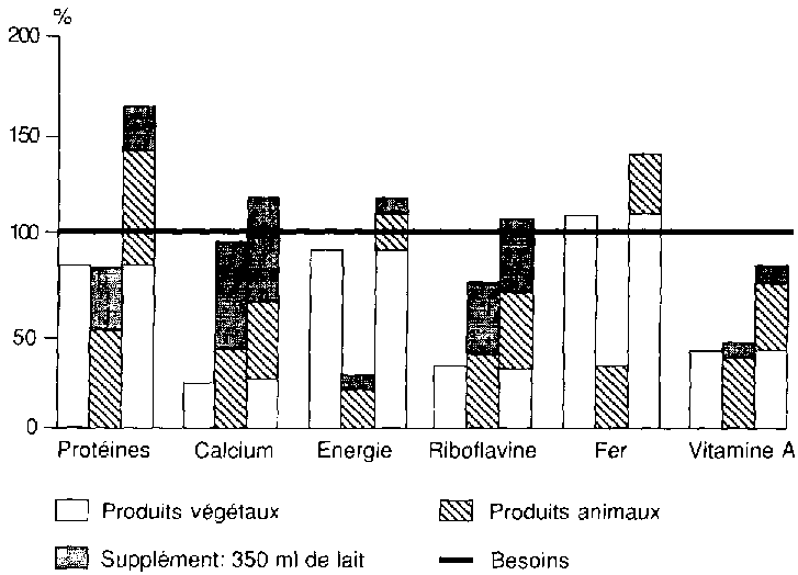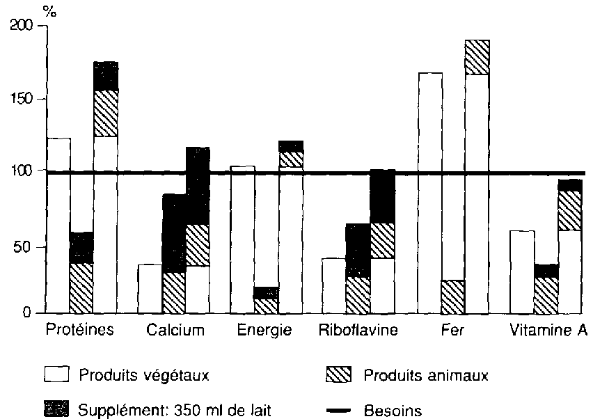 L'analyse des données chiffrées se rapportant aux régions d'Afrique, du Proche-Orient, d'Extrême-Orient et d'Amérique latine dévoile que l'apport lacté qui comblerait le déficit en calcium oscille de 250 à 400 ml. Une telle pratique permettrait de rehausser un apport protéique apparemment acceptable, mais essentiellement végétal, donc de fait assez médiocre.
