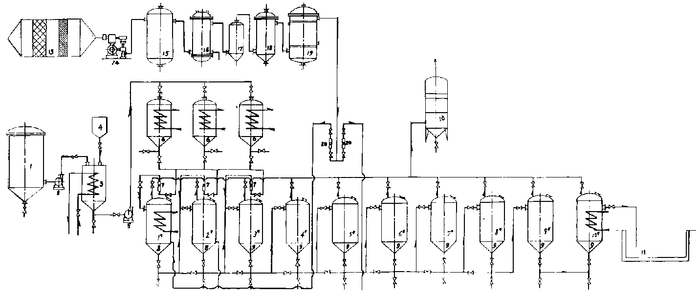 Only by maintaining the production all the year round can a system of refining alcohol increase the utilization ratio of equipment and the economical benefits. Therefore, in the project of EIDBCCNR, integrated technology of refining alcohol from three kinds of materials - sugar, starch and juice of sweet sorghum should be employed, Fig.4.3.19 shows the technological process of refining alcohol with three kinds of materials designed by the author, in which the system of refining alcohol with juice of sweet sorghum and waste sugar utilizes fermentation technology of fixed yeast biological reactor while the system of refining alcohol with starch employs fermentation technology of neither steaming nor boiling.