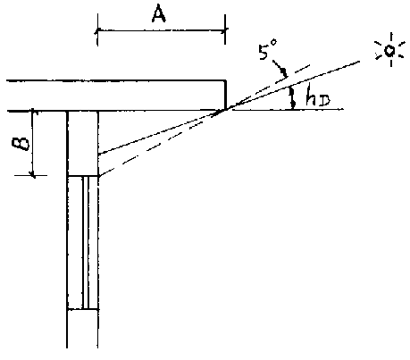 Shading of the south surface: to avoid solar collectors causing high room temperature in summer. a short overhang was built for shading. The length A of the overhang and the height B of the wall between the top of the collector and roof are determined according to the requirement that the overhang prevent the solar radiant from getting into the room as much as possible in summer but do not shade the collector during winter (Fig.8.7). For high latitude regions, it should be firstly realized that the overhang does not shade the collectors during winter. The noon solar altitude of the beginning of February is 5 degree more than that of the winter solstice. The following inequality can make sure that the collectors should not be shaded in January.