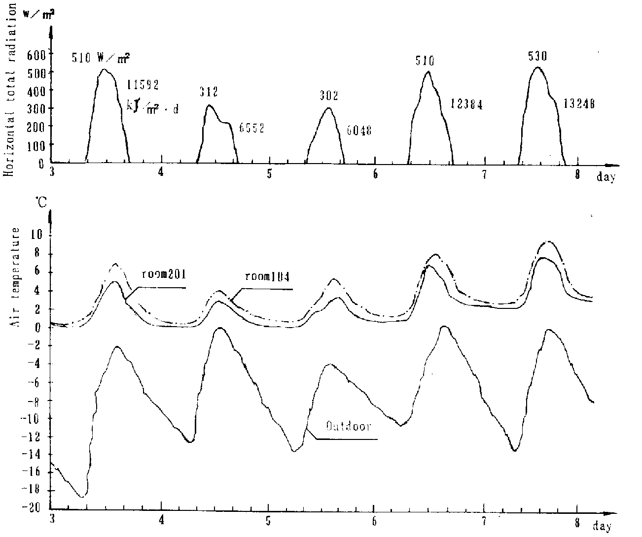 - Prevent methods of cold air infiltration: the frame and glass of window is connected with a rubber strip instead of glass putty. Insulating blankets are used on windows and doors- Type and layout of collectors: the direct gain window areas are 1.8x1.8m, 2.25x2.1m and 2.25x1.8m. A sunspace (1.5m wide) is attached to room 102. Two collectors are installed on the walls between the windows of room 104 and 202 and one collector under the windows One collector is on the wall between the window of room 201. The collectors mentioned are built with 0.24m clay brick covered with a single layer of glass. Two holes are opened on the top and the bottom of the wall collector. The wall collector (Trombe wall) supplies heat to the room mainly by conduction and convection. The daily use of the building requires the inside air temperature increase rapidly after sun rising. So the collectors are built with (from inside to outside): 0.24m clay brick, 0.04m polystyrene board as insulation, 0.001m iron plate absorber painted black, 0.060m air space and 0.003m glass. Solar energy absorbed by the collector is carried into room mainly by air exchange instead of conduction through the wall. The air temperature increases rapidly.