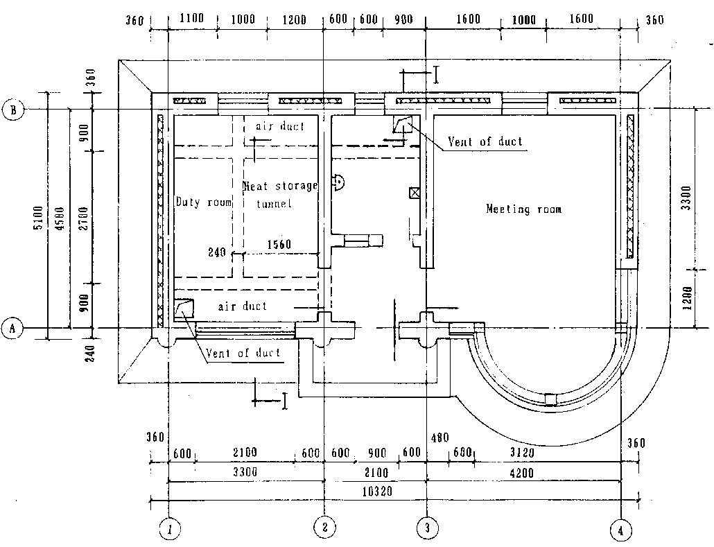 The special construction of the house was concentrated on air collectors, a heat storage system and an envelop insulation. The direct gain windows are: 4.41m2 for duty room, 7.8m2 (projection on vertical plane) for the meeting room. The left south wall was built with 0.370m clay brick. The west wall, north wall and east wall were built with: mortar outside surface, 0.12m clay brick, 0.1 m polystyrene form board, 0.24m clay brick and indoor surface mortar. The thermal transmittance coefficient is 0.376 W/m² · °C. Dry cinder of 0.2m wide and 0.5m thick was laid along the perimeter of the floor lined with a moisture barrier. Under the floor structure is 0.2m thick dry cinder. The roof was built with: reinforced concrete hollow board, 0.2m thick 1: 10 cement, pearlite mortar, cinder sloping layer with an average thickness 0.083m and a water barrier layer. The thermal transmittance coefficient of the roof is 0.73W/m² · °C. A double layer wooden out door and double layer wooden windows were installed. The duty room window was covered with a thermal blanket (heat resistance 0.3m2· ° C/W). For the duty room, the air collector was installed on the roof and the gravel heat storage tunnel with vent duct and fan were built under the floor forming an active-passive combined heating system. This system was built with cheap materials, and could be constructed and maintained easily. It can not be frozen during cold winter.