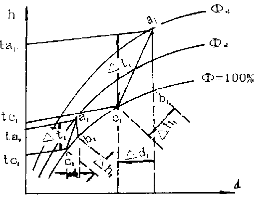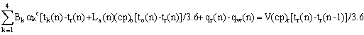 where qr (n) is the energy obtained from the sun, lighting, supplemental heat, equipment and so on, W; La (n) is the air infiltration at moment, m³/hr.; qw (n) is the sensible heat loss of water evaporation, W; V is the volume of the simulating unit, m3; (cp)o, (cp)r are thermal capacity of the outside and inside air at moment respectively, KJ/m³. °C