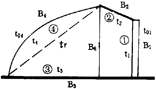 t01, t02 t03 are the sol-air temperature of outside surface 1, 2 and 4 respectively. The solar energy gain by the south roof is considered in the calculation of t04, i.e.