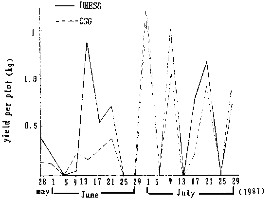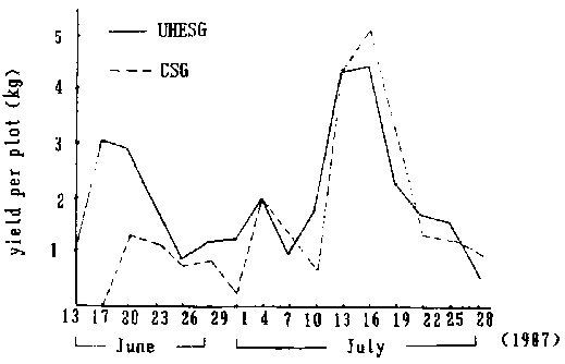 In the experiment of 1987, the manuring standard was 250kg of pig manure and 200kg of horse manure for one greenhouse (62.4 (C) and 3g of urea for each plant, According to the available information, the N content in Pig manure is 0.34%, in horse manure 0.2% and in urea 45%, Through calculation, the manuring amount of N in the experiment was about 21.46kg/667 (C, much higher than the necessary amount 16.3kg/667 (C, for tomato of the 5000kg/667 (C yield level. Therefore, much nutrient was remained for the next crop, even if a part of it was evaporated or leached out. But in the experiment of 1988, the manuring amount was 200kg of pig manure for one greenhouse and 2.5g of (NH4) 'vPO'w for each plant, amounting to 9.7kg/667 (C of N. It seems much lower than the necessary amount for tomato production. If was not unexpected to see nutrient deficiency in the later period in 1988.