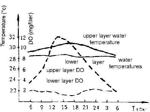 It is well-known that fish or shrimp living in water need dissolved oxygen (DO) and feed. The dissolved oxygen is supplied by the photosynthetic process of algae or comes from the atmosphere by means of surface aeration. The former represents about 90% the total dissolved oxygen, that is to say that the percentage of dissolved oxygen depends largely upon the amount of algae and sunlight available. The dissolved oxygen is produced in the top layer of the water. However, the oxygen is consumed mainly in the middle and bottom layers of the water. Under natural conditions, the diffusion of dissolved oxygen is so slow that during sunny days the dissolved oxygen in the top layer of the water exceeds saturation and escapes into the atmosphere, while the bottom of the layer is in anaerobic state. The variations of dissolved oxygen and temperature in a fishpond are shown in Fig.1.