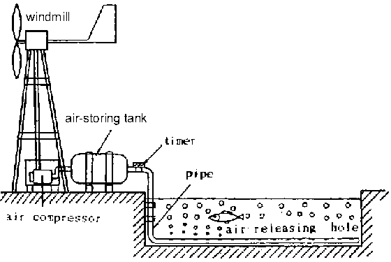 The air-filling type of equipment is used to fill air into water by using wind power to drive an air compressor. A schematic diagram of oxygen-enhancing equipment driven by a horizontal axle windmill is shown in Fig.2. The air compressor is driven by the windmill and the compressed air is stored in an air storing tank, which releases the air through pipes into a fishpond. The smaller the air releasing holes are so that the air bubbles take on fog shape, the more easily oxygen from the air is dissolved in water.
