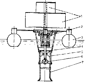 A schematic diagram of a vertical axle wind power oxygen-enhancing equipment is shown in Fig.3. The wind wheel is double layer S-shape vanes, which are welded at the top of the hollow vertical shaft. Air intake holes are drilled on the hollow shaft near the bottom of the vanes. A vane wheel is mounted at the bottom section of the hollow shaft and air releasing holes are drilled on the hollow shaft near the vane wheel. A flow guiding pipe is stretched along the bottom of the fishpond. The whole oxygen-enhancing equipment floats on the water by means of a pontoon.