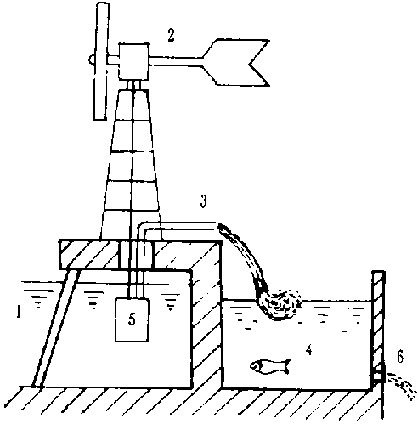 A schematic outline for jetting water aeration by using a windmill to drive a pump is shown in Fig. 4. A pump which is driven by a windmill lifting water from a river and jetting it into a fishpond. When the water in the fishpond is excessive, some old water can be drained off. Therefore, the advantage of this type equipment is that the water in the fishpond is continuously being replaced by fresh water during the oxygen-enhancing process.