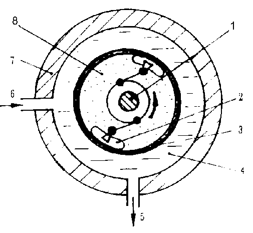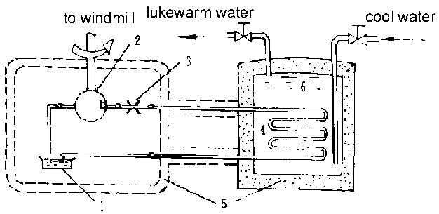 This way is to generate heat by means of a hydraulic pump and damping holes. A schematic diagram of this type of equipment is shown in Fig.8. The hydraulic pump is driven by windmill power output axle to press the actuating liquid (such as machine oil) which gushes from the narrow damping holes and dashes against the liquid which is in the tail liquid pipe. As a result, heat is generated. The flow velocity of the actuating liquid in the heat exchanging pipe is reduced and the temperature of the actuating liquid is increased. Then the actuating liquid to heat the water in the water tank is passed through the heat exchanger pipe.