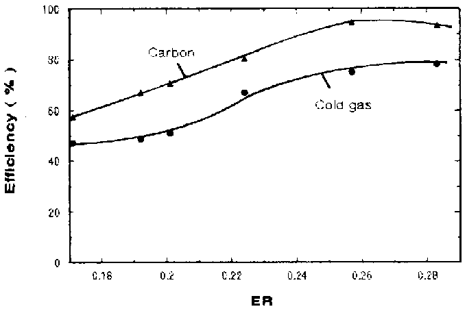 Fig. 2. Graph of cold gas efficiency and carbon conversion vs.ER