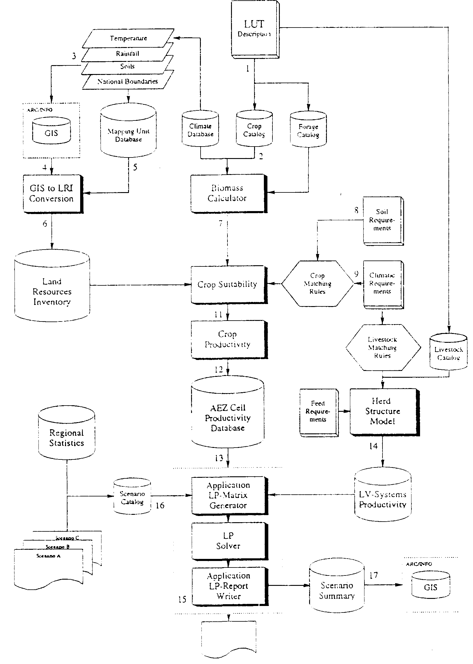 FAO has assisted member countries in finding rational solutions to various problems of land resources appraisal for planning sustainable agricultural development. This involves linking land use options with other development goals in such areas as food production, food self-sufficiency, cash crop requirements, population supporting capacity, issues of soil fertility constraints, soil erosion risks and land degradation. The AEZ approach was first applied in a global study of Land Resources for Populations of the Future (FAO/UNFPA/IIASA, 1983), which focused on the determination of ecological potential of land resources for food production and the appropriate policies for their management. Subsequently, the AEZ methodology has been extended, refined and utilized in national and sub-national assessments of land productivity and population supporting capacity in various countries, such as Bangladesh, China, Mozambique, Nigeria, the Philippines, Thailand. To further enhance the AEZ methodology for national and sub-national applications, FAO, with the concurrence of the Kenyan Government and IIASA's participation, undertook an AEZ case study of Kenya. The Kenya study (FAO/IIASA, 1991) features various advances in AEZ procedures; these include the linkage to Geographic Information Systems (GIS), methodological refinements and development of a resources database. The enhancements encompass representation of multiple cropping systems, livestock and crop sector integration, assessment of fuelwood productivity, optimization of land use. A major GlS-oriented Kenya land resources database at the scale of 1:1 million and a PC and UNIX workstation based software system were developed in the case study. This analysis tool facilitates the integration of ecological, technological, social, demographic and economic recommendations for the appraisal of land resources of individual districts in Kenya for policy formulation and development planning.