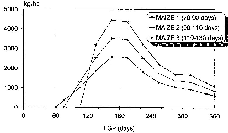In the yield generating module, both these situations are evaluated and average yields are derived. Table 2.2 sumniarizes the relevant information on maize yields in LGP-pattern zone 13 (dominantly bimodal), mean dominant LGP zone 9 (210-239 days), at intermediate level of inputs. Crop types are considered viable only if the growth cycle fits entirely within the longest growing period (long rains) of the dominant pattern component. In this example, the dominant pattern component is bimodal (70 percent of years), the longest component LGP is LGP21 with 120-149 days. Table 2.2 shows that in low-land areas (thermal zone T1-T3, i.e., at an altitude < 1550 metres), Maize 3 performs best; in thermal zone T4 (15501950 meters altitude) only the shortest high-land maize types, Maize 4 with 120-140 days growth cycle, could be cultivated. Figure 2.2 shows agronomically attainable yields of lowland maize types according to length of component growing period, at intermediate level of inputs.