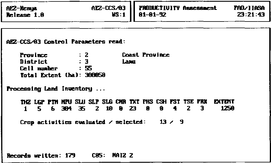 The screen display of the productivity assessment module (see Figure 2.3) provides information on the progress of the assessment. It shows the attributes of the agro-ecological cell being processed and indicates the number of crop combinations analyzed and accepted in the current cell. Also, the cumulative number of records is indicated which are saved for later use. On a PC, evaluation of larger districts with several thousand agro-ecological cells, e.g., Meru district, may take several minutes.