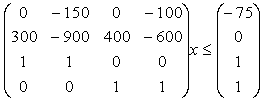 Production q=(q1, q2, q3, q4) obtained per unit of activity is easily calculated. For instance, crop A produces q1 = 3 t/ha x 100 ha = 300 tons on land unit LU1, and q3 = 2 t/ha x 200 ha = 400 tons on land unit LU2; crop B produces q2 = 1.5 t/ha x 100 ha = 150 tons on land unit LU1, and q4 = 0.5 t/ha x 200 ha = 100 tons on land unit LU2. Production of crop B. related to activity levels x2 and x4, defines the coefficients to be used in the first constraint (item (2) above). Note that a 'greater or equal' constraint can be converted to 'less or equal', by multiplying with a factor of -1.